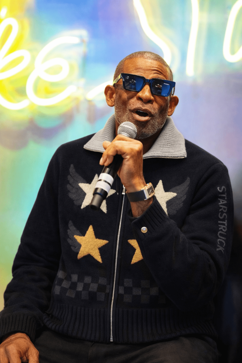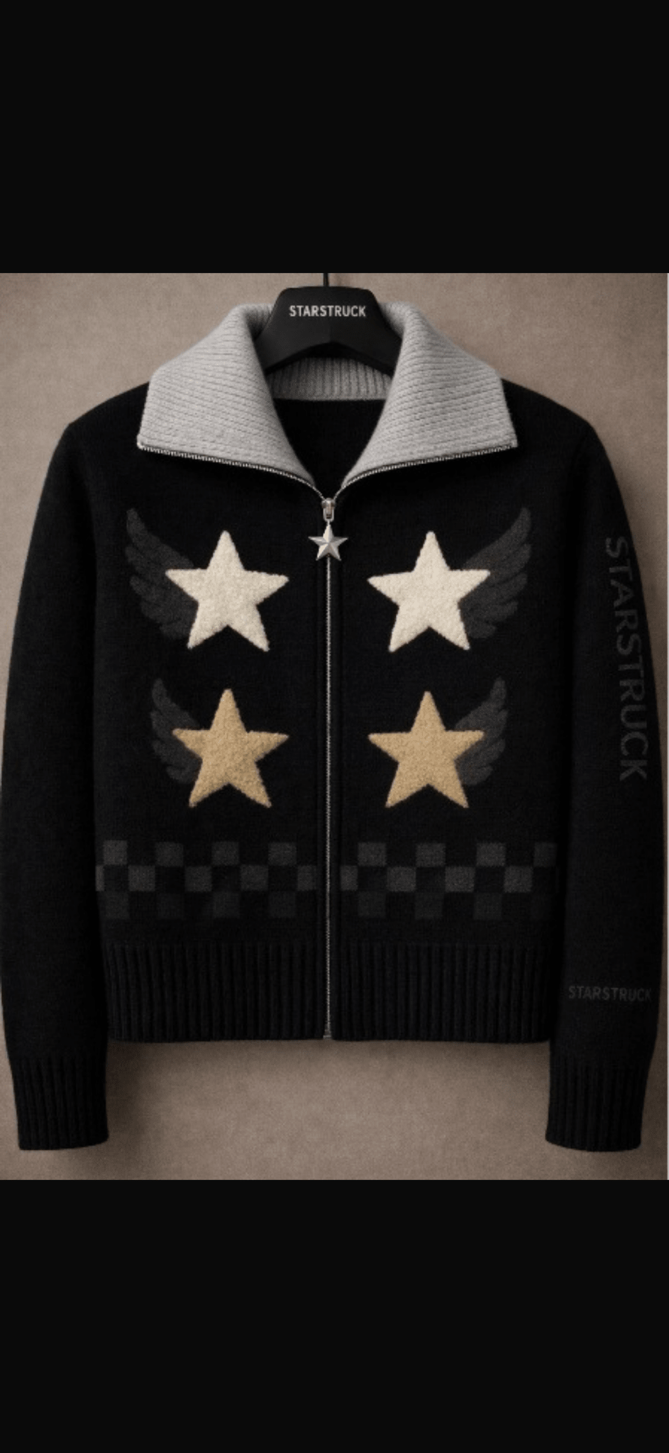 Premium luxury designer cardigan in sophisticated black with vibrant multi-color star embellishments and wing details. This ensemble delivers whimsical charm and celestial sophistication, combining cozy comfort with contemporary dark mood-inspired design. Crafted from revolutionary StarFlex™️ fabric for ultimate softness and luxurious warmth. Whether layered over a tee or styled as a standout piece, it brings cosmic energy to your everyday wardrobe.